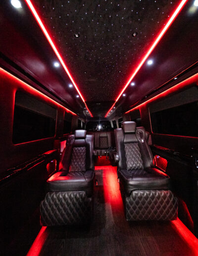 Spacious cabin with generous headroom, ample legroom, and flexible seating configurations – including executive chairs, lounge layout, or group transport